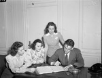 College Girls. Defense efforts. Baylor University. Defense council: left to right, Betty Green, Shreveport, Louisiana; Marilyn Harwell, Burk Burnett; Susan Sandeford, Belton and Bill Allcorn, Brownwood.