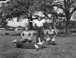 College Girls. Defense efforts. Baylor University. Group exercising, left to right, Mary Frances Bradley, San Antonio, Texas; Camille Mitchell, Waco, Texas; and Evelyn Jenson, Waco, Texas. Regina Owens, Louisville. Kentucky is on the ground.