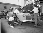 College Girls. Defense efforts. Baylor University. Girls working on a car, Virginia Ruth Vickers Odessa, and Mary Honaker, Waco, Texas, working on motor, while Margaret Wells checks a tire.