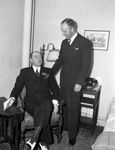 Reverend Berry E. Gresham, standing, right, is playing host to visiting Reverend Edgar DeWitt Jones, seated. Reverend Jones is a noted minister from Detroit, Michigan. He is in Fort Worth, Texas, to speak at a city-wide interdenominational meeting at the First Methodist Church. Revered Jones is dressed in a double breasted pinstripe suit. He has a handkerchief in his pocket, and a carnation pinned to his lapel. Reverend Gresham is the minister of University Christian Church. He is wearing a double breasted suit. There is a telephone on a side table and a picture hanging on the wall in the background.