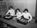 University of Texas. Defense efforts. Eleanor Ott, left, and Margaret Frueholz, right, teach Shirley Moddy, 11, and Lovell Davis Junior, 11, leather handwork.