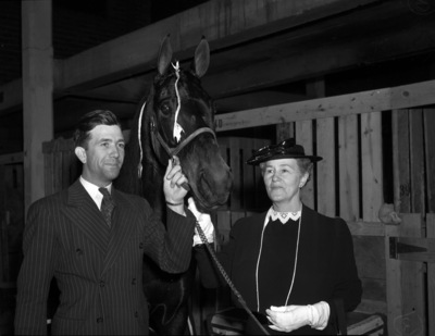 Southwestern Exposition and Fat Stock Show contestant "Bourbon Rex", owned by Walter H. Gant of Admore, Oklahoma with Mrs. W. H. Bowen of El Paso, Texas, and Paul Fagan, trainer for Mr. Gant. Both Mrs. Bowen and Fagan are seen standing inside a barn holding the straps of the winning horse.
