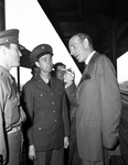 "Now we're all immortal," said Lord Halifax with mild British humor as he was photographed talking with two soldiers on the station platform here Friday. His brief chat was chat was with First Lieutenant T. H. Sutton, of Fayetteveille, North Carolina (left) and Corporal Joe Greer of Monroe, Georgia.