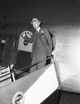Lord Halifax is standing waving his right hand next to the passenger door of an airplane.