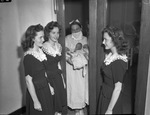 The grown-up Briant triplets meeting the infant Ogle triplets at All Saints Hospital, where the babies were born a week prior. A nurse, Mrs. D. J. Ryon, is holding the three babies behind a glass panel. Elaine Briant, left, and Maureen Briant are standing at the left side of the panel, and Kathleen is standing at the right. They are daughters of Mr. and Mrs. Guy Briant. The Ogles, daughters of Mr. and Mrs. Horace Ogle, are Marlene, Merlene and Maxine. The Briants are wearing matching short-sleeve, dark dresses. The collars of the dresses are of a transparent, lace material. The Ogles are wrapped up in blankets and Mrs. Ryon is wearing her nurse uniform and a surgical mask.