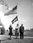 Mr. and Mrs. E. H. Henderson (right) and their daughter, Mrs. Ben A. Hardin, are shown standing beneath the American and service flags which fly in the front yard of their home at 3807 East Lancaster Avenue. The three stars on the service flag are for Sergeant Ellis Henderson, Private First Class Earl Henderson, and Private First Class Ben A. Hardin. Mrs. Hardin is wearing a short-sleeve, dark dress with a pair of glasses; Mrs. Henderson is wearing a long-sleeve blouse tucked into a skirt and Mrs. Henderson is wearing a dark suit with a pair of eyeglasses, as well. Published in the Fort Worth Star-Telegram evening edition, April 24, 1942.