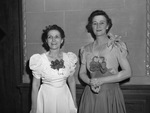 At the President's night dinner of the Euterpean Club Wednesday at the Woman's Club were the honoree, Mrs. Ellen Jane Lindsay, retiring president, right and Mrs. Harry Brooks Baker, chorus sponsor. Mrs. Lindsay and Mrs. Baker are wearing evening gowns and corsages. Mrs. Lindsay is wearing a string of pearls. Published in the Fort Worth Star-Telegram morning edition, April 23, 1942.