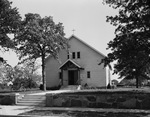 Exterior view of Saint George's Catholic Church. It is a simple building with a cross on the building roof and porch roof. There are several steps leading to the front entrance. On the front side of the building by the door is a sign that reads, "Saint George's Church Mass Every Sunday 7-9-11 A.M." On the lawn are several trees and a bicycle.