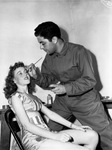 Private Jerry Server, applying makeup for Miss Phoebe Cheves, Wichita Falls, Texas, for the Sheppard Field musical show.