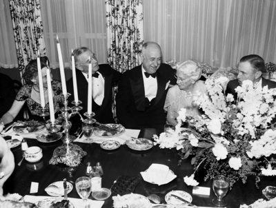 Mrs. Katherine Kingsbery Stripling (second from right) celebrating her 89th birthday with Amon Carter (center) and other guests. Mrs. Stripling, Carter and three guests are sitting at a dining table. Carter is wearing a suit with a bow tie and Mrs. Stripling is wearing a dress. On the table are plates of food, drinks, a candelabra and a floral centerpiece.