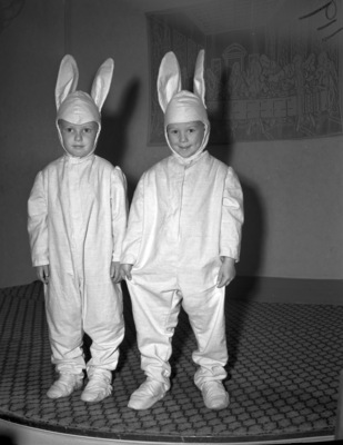 (Left to right) Dickie Lee Southard and Jerry Culley are dressed in Easter Bunny costumes. They will be in the parade of Easter bunnies, an Easter program and style show to be presented by the beginners department of the Sunday school at First Christian Church.