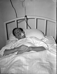 Victims in the North Side shooting which cost the life of one woman and injured a 16-year-old grocery clerk. In this picture is John Miller who is injured from the shooting. He is shown laying in a hospital bed with his hands folded as he looks at the camera. He is wearing a hospital gown and has a large bandage on the side of face to cover the shooting wound. His body is covered primarily by the bed blankets. Published in the Fort Worth Star-Telegram morning edition, May 3, 1942.