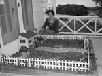 A victory garden, exhibited by Mrs. David McGee of White Settlement Road, at a flower show sponsored by North Fort Worth Garden Club at Rockwood Park. Mrs. McGee is sitting next to her garden, wearing a blouse, skirt and a hat. The miniature garden is surrounded by a picket fence. There are small American flags and a dollhouse in the garden along with sprouts of different plants and vegetables.