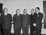 These pastors were prominent at the Methodist School of Evangelism which closed Wednesday at Arlington, left to right, Harry Denman, Nashville, Tennessee; Reverend Roy Short, Louisville, Kentucky; Reverend Roy Langston, Cisco; Reverend E. A. Hunter, Wichita Falls and Reverend Hayden Edwards, Fort Worth. They are standing next to each other.