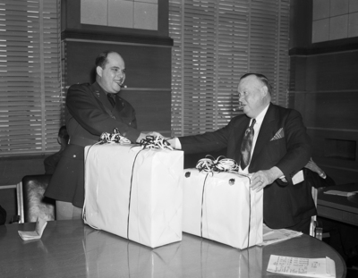 Councilman R. H. W. Drechsel, to be Captain in medical services at Fort Sam Houston, being presented with luggage by Fort Worth, Texas mayor I. N. McCrary. Captain Drechsel will be a dental instructor in the medical specialists' school. Captain Drechsel is wearing a military uniform while the mayor is wearing a suit, very short tie and pocket square. Two pieces of luggage sit on a table in front of the men, both of whom are smoking cigars while shaking hands. Published in Fort Worth Star-Telegram March 19, 1941.