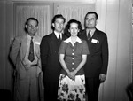 Left to right: N. K. Burke, Thomas E. Boyle, Miss Virginia Martin, and W. S. Bussey. The group of four is shown standing in front of a set of double doors with curtains with Mr. Burke using crutches to help hold him up. Miss Martin is wearing a floral printed dress and a buttoned-down, short-sleeve shirt. Mr. Boyle and Mr. Bussey are wearing dark, double-breasted suits while Mr. Burke wears a lighter colored suit with glasses. Mr. Burke and Mr. Bussey are also wearing name tags and Miss Martin is holding a few papers. Published in the Fort Worth Star-Telegram morning edition, May 9, 1942.