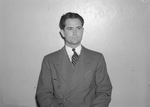 Weldon Hart is standing and dressed in a three-piece suit and striped tie.