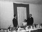 A Panther Boys Club service flag was presented at the Men's and Boys' Banquet at club headquarters. There are 126 blue stars for members now in military service and six gold stars for the club's solders killed in action. Left to right looking at the flag are George Kemble, Joe Stripling, and Doctor J. H. McLean. They are standing behind a long table with candles, dishware, and food. Mr. Kemble is wearing a double breasted suit with a handkerchief in the pocket. Joe is a nine year old member of the club. He is dressed in a button-up shirt and trousers. Doctor McLean is wearing a three piece suit and a pocket square.