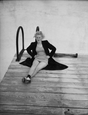 Betty Ann Cavender is one of the most unhappy misses in Fort Worth, Texas. She suffered through a sweltering Wednesday when the temperature reached 93-degrees. On Thursday, she donned her bathing suit and hurried to the Forest Park pool only to find it closed. The temperature dropped over night and the crisp spring morning required a coat. She is shown pouting on the dock in her bathing suit and coat.