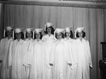 Mount Carmel Academy graduates for 1942 are (left to right) Misses Willa Mae Goodner, Elsie Mikusek, Mary Jo Mulholland, Anna Franko, Lillian Becan, Josephine Strittmatter, Lily Paul and Frances Marie Faust. The young women are all wearing their graduation caps and gowns. This photograph was published in the May 18, 1942 evening edition of the Star-Telegram.
