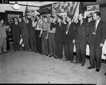 Coast Guard recruits..Swearing them in is Lieutenant Virgil A. Smith. Left to right, the men are J. W. Dunwoody, E. C. Purvis, A. G. Bidwell, Wilford Matlock, J. E and T. M. Wood, Chick Boone, W. O. Hodges of Denton, Texas, C. H. Turner, and Theron Francis.