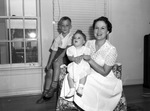 "Mrs. J. M. Dysart and children, Douglas Kyle and little Kay Elise, 3916 Birchman Avenue, will leave Saturday for Baltimore to join Mr. Dysart and make their home." Mrs. Dysart is sitting on what seems to be a particularly low-seated armchair, holding her young daughter who is looking off into the distance. Mrs. Dysart is wearing a light-colored dress with netted detail. Kay Elise is wearing a white dress with a sheer cover. Douglas Kyle is sitting on her right side, leaning into the chair's arm and looking directly into the camera. He is wearing striped socks, lace-up shoes, a polo shirt, and vertically striped shorts. Each of them are smiling.