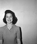 Mrs. Marion K. Bailey, the former Miss Mildred Watson. "Watson, was married to Mr. Marion K. Bailey, son of Mr. and Mrs. C. A. Bailey of Benbrook, February 20 in Marietta, Oklahoma. The newlyweds are at home at 754 Eighth Avenue." Mrs. Bailey is wearing her dark bangs pulled back into a pompadour while the rest of her hair is hanging down in curls. She is also wearing a medium-toned collared blouse which appears to be studded. She is holding her arms to the side, as she is smiling a big, easy smile as she looks directly into the camera.