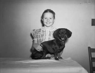 Among the young fanciers who will exhibit their puppies at the Southwestern Dachshund Club's show at the Pioneer Palace is Norma Shulz, daughter of Mr. and Mrs. R. Shulz, with her black dachshund puppy, "Cecelia".