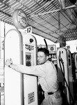 J. Ray Weir, checking ceiling prices while standing beside a gasoline pump.