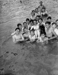 Sycamore Park. Swimming pool opening. Estelle Caldwell, sititing in the inner tube, is surrounded by youthful swimmers at the opening of the Sycamore Park swimming pool.