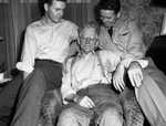 Captain Fred T. Crimmins Junior (right) with his brother Adrian (left) and their father, Fred T. Crimmins Senior. "Fort Worth Hero- Fort Worth's Distinguished Service Cross hero, Captain Fred T. Crimmins Junior, at right, with his dad, center, and 'kid' brother, Adrian, at their home at 1410 South Jennings Avenue. Captain Crimmins was awarded the medal for bravery in the Philippines December 8." The elder Crimmins is sitting in an armchair and looking directly into the camera. Even though he is not smiling, he seems to be happy. Captain Crimmins has his arms around his father and is looking down at him, smiling. Adrian has one arm around both of them, and is looking down at his father with a look of tenderness.