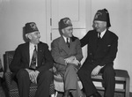 The Spring Ceremonial of Moslah Shrine Temple this weekend was planned Monday by R. A. Massey (left), Jack McGraw (center), and Steve Cooke (right). The three men are shown seated in a chair and benches and planning Moslah event. All are wearing suits and ties, and fezzes. Mr. Massey is the oldest living past potentate. Mr. McGraw is present potentate and Mr. Cooke is a past potentate. Published in the Fort Worth Star-Telegram morning edition, May 19, 1942.