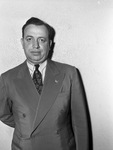 Sam Laves, high priest of the South Side Chapter 378, Royal Arch Masons. "Sam Laves was elected high priest of the South Side Chapter 378, Royal Arch Masons, and thrice illustrious master of South Side Council 315, Royal and Select Masters Thursday night." Mr. Laves is wearing a medium-toned double-breasted suit with peaked lapels, a checked undershirt, and floral pattern tie, and an airplane lapel pin. He has one arm behind his back, he is wearing his hair slicked into a small pompadour, and he is gazing without expression into the camera.