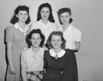 New officers of Polytechnic Assembly Number 85, Order of the Rainbow for Girls for May, 1942. Front row: Virginia Thaxton, worthy associate advisor, and Nada Green, worthy advisor. Back row: Doris King, officer of Faith, Marry Lorrane Williams, officer of Charity, and Nelda Leissner, officer of Hope. They are in front of a bare wall. Miss Greene and Miss King are wearing dresses and Miss Thaxton, Miss Williams and Miss Leissner are wearing blouses and skirts.