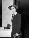 Miss Mary Findley and flowers that won prize. Miss Mary Findley, with a low rectangular pewter container of pansies that won her first place in the pansy classification and also the sweepstakes prize at the Spring flower show of the Business and Professional Women's Club at Hotel Texas last week. The garden group of the club sponsored the show. Miss Findley appears to be holding some gloves and a bag handle, and is standing next to table with a white table cloth with flowers on it. She is wearing a hat, glasses, a women's long skirt with a button up jacket, with a white stripped shirt underneath.