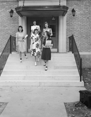 Ready to inspect Foster Hall, new dormitory for girls at Texas Christian University (TCU), are, left to right, front row, Miss Ruby Lee Tisdale, of Dallas, Texas; Miss Joyce Bush of McKinney, Texas; and Miss Tomasine Stanley, San Angelo, Texas. In the back row, left to right, are Miss Peggy Hancock, Dallas, Texas, and Miss Genevieve Able, Houston, Texas. All of the girls are wearing dresses and are standing on a stairway outside of a building.