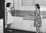 Looking over a kitchen in the new Foster Hall, girls' dormitory at Texas Christian University (TCU), are Miss Peggy Hancock, left, and Miss Genevieve Able. Miss Hancock is opening a kitchen cabinet and Miss Able is standing by a sink. Both women are wearing dresses and are facing each other.