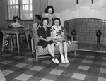 Miss Tomasine Stanley, San Angelo, Texas, and Miss Joyce Bush, McKinney, Texas, sitting on a couch, and Miss Virginia Williams, of Dallas, Texas, standing behind them, reading in a Spanish classroom at Texas Christian University (TCU). Miss Stanley and Miss Bush are holding a large book between themselves. All the girls are wearing dresses. There are two unidentified people in the background, sitting at a table.