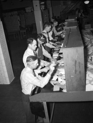 United States Postal Service; United States Post Office; Postal service; Postal service employees; Correspondence; Mail Sorting; Ivy, C. H.; Postal clerks; James, Charles; Eudaly, Freeman; St. John, H. C.; Hardwick, T. B.; Neckties; Visors