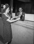 Mrs. Faye Garner, president of Fort Worth Beauticians Association, buying bond from Jack Rainer at Hotel Texans.