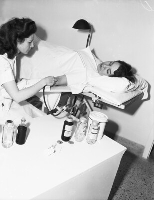 Blood plasma preparation. Miss Mary Connor demonstrating first step of process with Miss Mildred Guinn.