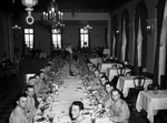 Father's Day dinner for soldiers at Fort Worth Club. "Dads shared the honors (and the dinners) of Father's Day with sons and others in the service...[Here] are 29 of the 30 soldiers who were Father's Day guests for dinner at the Fort Worth Club. Turned around and looking into the camera at the near end of the table is Private Emil P. Michaels, South Bend, Indiana. To his left and on around the table the are Privates Eugene Farrell, Plankinton, South Dakota; Arden G. Coley, Niles, Ohio; Jack Kezerle, Joliet, Illinios; Jack Harrison, Provo, Utah; Sergeant Daniel J. Frishberg, Los Angeles, California; Corporal John E. Grossman, Evansville, Indiana; Privates Harvey H. Pierce, Osborne, Kansas; Nick Borina, San Jose, California; Ludd J. Bryan, Apex, North Carolina; C. W. Soeurt, Indianapolis, Indiana; Marshall Studness, Gary, Indiana; Robert W. Taylor, Cleveland, Ohio; Arthur J. Watson, Cincinnati, Ohio; Lawrence Westover, Warren, Ohio; Leonard Sine, Cleveland, Ohio; Clifford J. Paintino, Milwaukee, Wisconsin; William P. Davidson, Peoria, Illinois; John M. Steele, Metropolis, Illinois; Corporals Robert D. Cooper, Cleveland, Ohio; Gordon Matthews, Chatham, Ohio; Dan Kern, New York City, New York; Edward Salow, Saginaw, Michigan; Private Dick Schneider, Saint Paul, Minnesota; Corporals John Mattson, Saint Paul, Minnesota; Al Selleck, Saint Paul, Minnesota; Max B. Allen, Chicago, Illinois; Perry Stefani DeKalb, Illinois; and Sergeant R. P. Kundert, New Glarus, Wisconsin. Another soldier, Bob Layman, Chicago, is not in the picture. Also at the table were Dan Lydick, F. J. Adams, Tom B. Carvey, Hugh Scarborough, Frank Bailey, and Amon Carter. The soldiers were guests of Carter"
