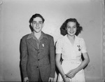Good citizenship medal award winners of W. C. Stripling Junior High School were Jim Morgan (left), 13, and Agnes Butz, 14. Jim is the son of Mr. and Mrs. C. L. Morgan. Agnes is the daughter of Mr. and Mrs. H. J. Butz. The awards were presented by the Fort Worth, Texas, Chapter of the Daughters of the American Revolution. The two students are standing in front of a blank wall. Jim is wearing a textured suit jacket, collared shirt and trousers. Agnes is wearing an eyelet patterned blouse and a skirt. Both students have their citizenship medals pinned to their clothing.
