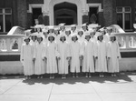 Shown here are Our Lady of Victory Academy seniors who are to receive diplomas. They are wearing their white graduation gowns and caps. The background of the photograph is the entrance to a hallway of the academy. Published in the Fort Worth Star-Telegram.