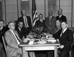 Eight soldiers' dads were honored at a military program at the North Side Kiwanis Club luncheon. The attendees from left to right, are Paul Wynne, J. E. Mills, Harold M. Barnes, W. E. Lowe, Melvin Faulk, Judge Dave McGee, W. G. Fuller and J. G. Whittmayer. The men are shown either sitting or standing around a set lunch table. The table is covered in plates, glasses and eating utensils. The men are looking in different directions and are wearing suits and ties. All of the group, except Mr. McGee, is wearing a pair of eyeglasses. Further in the back are closed windows and an American flag. Published in the Fort Worth Star-Telegram morning edition, May 23, 1942.