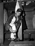 Rabbit Warstler, new infielder for the Fort Worth Cats, standing in the Cats' clubhouse. Warstler has his right foot raised on one of the benches and is pulling up his sock. He is wearing his Fort Worth Cats baseball uniform and a dark baseball cap that has "FTW" written across it. Behind him, another long bench and a few jackets hung up on the walls can be seen.