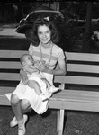 Riverside "Old timers' Jubilee" Mrs. J. M. Rawls with her 3 months old daughter, Sherry Diane. "Riverside residents, young and old, turned out Friday for the "Old-timers' Jubilee." Top, left, are Mrs. J. M. Rawls of 3319 Race Street and her three-month-old daughter, Sherry Diane, who preferred a bottle to the barbecue. Mrs. Rawls, 19, is a native of Riverside and the daughter of Mr. and Mrs. Phillip E. Brothers of 1205 Bonnie Brae". Mrs. Rawls is on a wooden bench in the center left of the photograph holding her 3 months old daughter Sherry Diane Rawls. She is wearing a horizontally striped blouse, a white skirt, and white shoes with ankle socks. She wears a large swirled necklace, a watch on her left wrist, and a ring on her left and right ring fingers. Her hair is dark and half up and half down with a bow in the back. She is looking to the right of the camera and is smiling broadly as she feeds her daughter a bottle. Sherry Rawls in on her mothers lap in the center of the photograph. She is wearing a light colored dress and white baby shoes. She drinking a small bottle and is looking up at her mother with a confused look on her face. In the background a tree trunk, bush, vehicle, and house can be seen. The bench is sitting on a grassy surface.