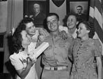 The Catholic Community Center in Fort Worth, Texas is hosting a Saturday night dance. Corporal Joe Reith is selected as the "handsomest soldier". He is surrounded by 4 women who were judges of the contest, left to right Geraldine Moore, Irene Rupprecht, Mary Clement, and Rebecca Hembree. Corporal Reith is a soldier in Company A, 58th Training Battalion at Camp Wolters, originally from Glendale, California. He is dressed in his military uniform as he receives a carton of cigarettes as his prize. The ladies are members of the Victory Girls Dance Committee. Miss Moore is wearing a collared dress and a bow in her hair. Miss Rupprecht is dressed in a button-up blouse with a lace collar. Miss Clement is dressed in a blouse and a checkered skirt. Miss Hembree is wearing a button-up floral dress. There are two portraits hanging on the wall and an American flag in the background. Published in the Fort Worth Star-Telegram evening edition, May 25, 1942.