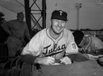 Roy Johnson, manager of the Tulsa Oilers minor league baseball team. He is sitting beside the baseball field, writing on a small piece of paper. He is wearing his Oilers uniform and a dark baseball cap. Sitting behind him, at right, is another Oiler player, and standing at the far left is a man wearing a military uniform. Johnson and his team are playing against the Fort Worth Cats at LaGrave Field during the Texas League baseball season.