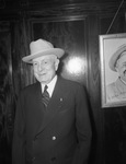 Thomas J. Watson, of New York, president of the International Business Machines Corporation (IBM), visited Fort Worth, Texas. He is standing against a wall, wearing a double-breasted suit and a Shady Oak hat. Hanging on the wall, at right, is a framed portrait photograph of Will Rogers (partially obscured).